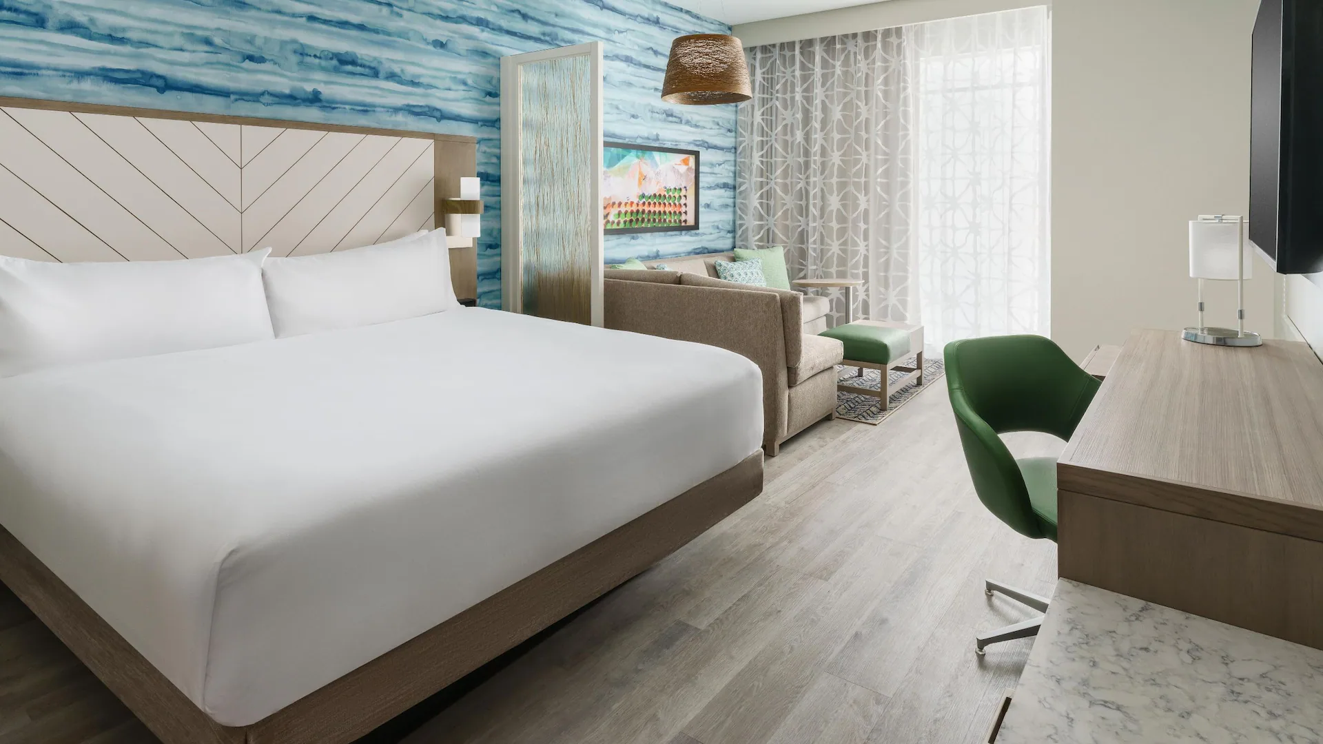 The hotel offers spacious rooms designed for comfort and convenience. Each room is equipped with plush bedding, a seating area with a sofa, a 42-inch flat-screen TV, and a mini-fridge. The modern bathrooms feature walk-in showers and complimentary toiletries. Select rooms provide stunning ocean views, enhancing the overall guest experience.