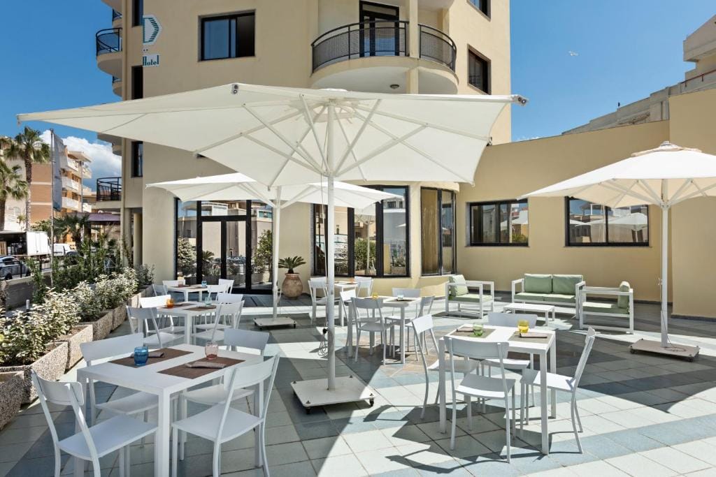 From the outside, the hotel has a classic Mediterranean style with bright, welcoming facades, while inside you’ll find a modern, laid-back atmosphere with a light-filled reception area and comfortable lounge spaces — great for meeting friends or simply unwinding after training or racing.