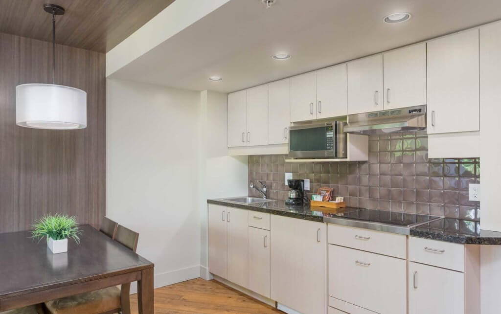 Studio with queen bed and private washroom. Features include sitting area with telephone, flat-panel TV, air conditioning, fully-equipped kitchen, complimentary wireless internet, coffee & tea. Maximum 2 guests per suite